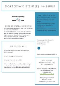 Vacature doktersassistente 13 september 2024Ivm het vertrek van 1 van onze assistentes hebben we een vacature doktersassistent(e) 16-24uur. voor de volledige pdf klik hier; Onze doktersassistent
